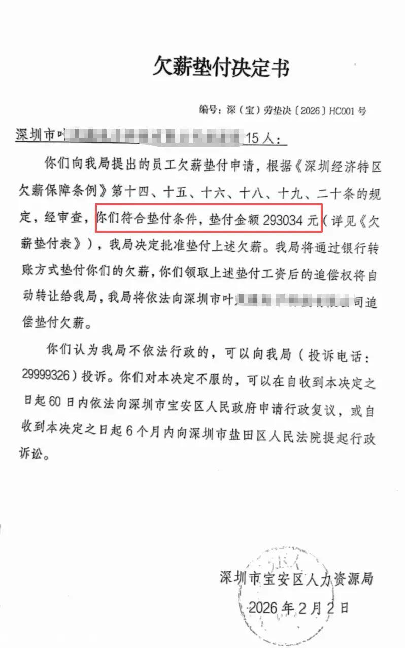 近日,一份落款为深圳市宝安区人力资源局的《欠薪垫付决定书》,在网络上引发广泛关注和热烈讨论。决定书显示,针对辖区内某企业15名员工的欠薪垫付申请,该局已批准垫付293034元。款项发放后,将由区人力资源局依法向涉事企业行使追偿权。